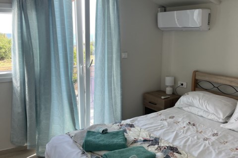 The first level hosts 2 bedrooms; 1 with queen bed and private balcony offering a wonderful view in the garden and sea, and one more with 2 single beds. Both bedrooms share a bathroom with shower.